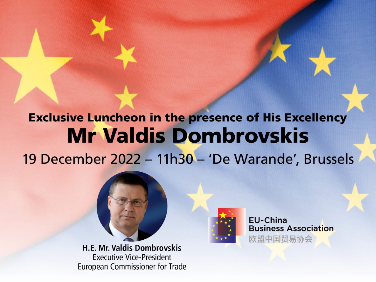 The EU-China Business Association has the pleasure to invite you to an exclusive luncheon with Mr. Valdis Dombrovskis, Executive Vice-President and European Commissioner for Trade at the European Commission. The EU Commissioner will deliver an address on EU-China trade and investment relations.